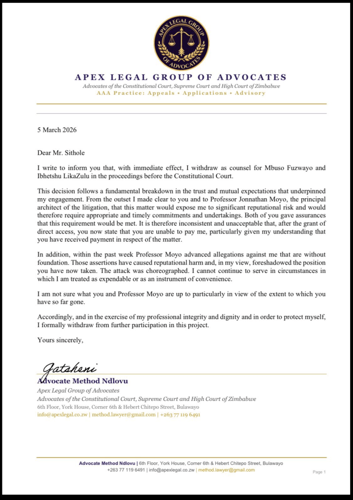 Ndlovu’s withdrawal has now left the high-profile application in uncertainty, with the applicants temporarily lacking legal representation. At the same time, the fallout between Sithole, Ndlovu, and Ncube threatens to escalate into a professional dispute that could ultimately be referred to the Law Society of Zimbabwe.